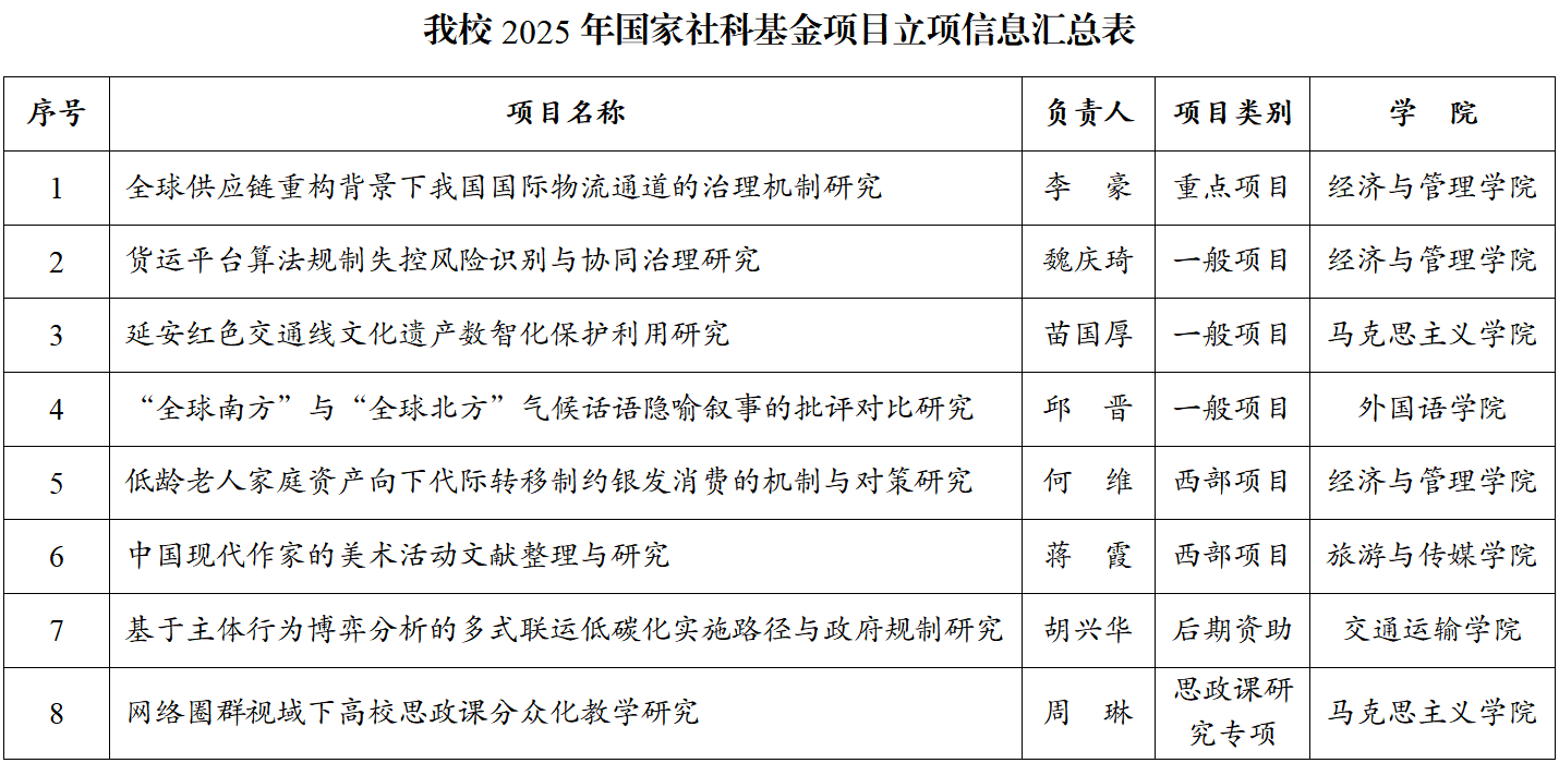 近日,全国哲学社会科学工作办公室公示了2025年国家社科基金后期资助项目和高校思想政治理论课研究专项立项名单,我院获得1项思政课研究专项,这是我校连续4年在这两类整体立项率不足13%的类别中获得立项。至此,我校2025年共获批8项国家社科基金项目,其中马克思主义学院获得2项,我院作为社科类学科逐渐凸显优势。
