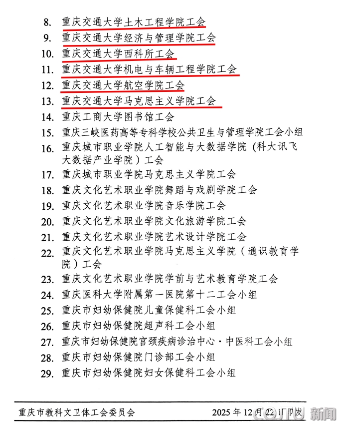近日,重庆市科教文卫体工会发布2025年三星级职工之家(小家)建设情况通报,重庆交通大学工会委员会和包括我院在内的8个分工会凭借扎实过硬的建设成效,成功获评”三星级“职工之家(小家),学校获评数量位居重庆高校首位。