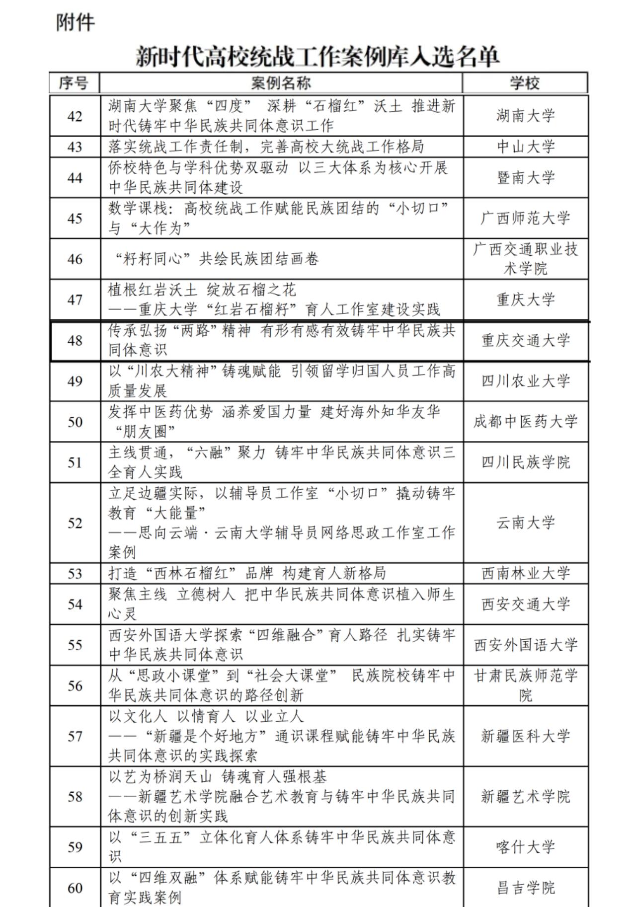 近日,由教育部思想政治工作司指导、中国高等教育学会统战工作研究分会组织评选的“新时代高校统战工作案例库”名单正式公布。经各学校申报、专家评审及公示等严格程序,全国共60个案例入选案例库。我院研究生导师任海涛、张建军两位教授共同参与执笔的案例《传承弘扬“两路”精神 有形有感有效铸牢中华民族共同体意识》成功入选,我校成为重庆市仅有的两所入选高校之一。