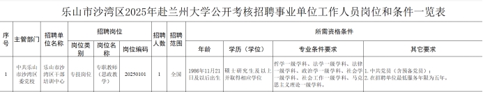 三、中共乐山市沙湾区委党校2025年赴兰州大学公开考核招聘1名事业单位工作人员的公告