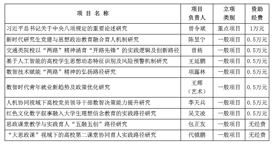 根据《重庆交通大学高校党建与思想政治教育研究中心专题科研项目管理办法》,经专家匿名评审,拟对10个项目予以立项,现公示如下。