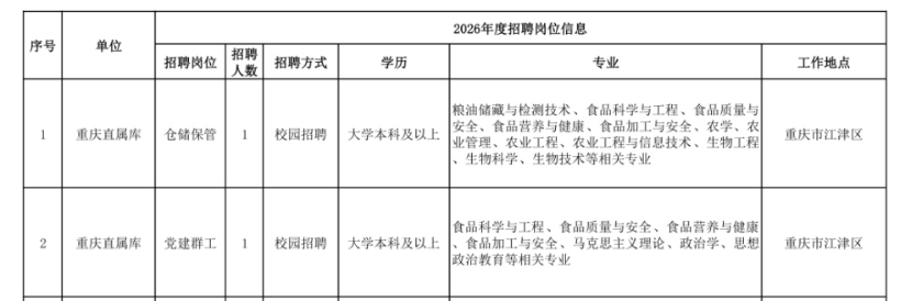 中储粮集团成都分公司2026年度公开招聘岗位信息表