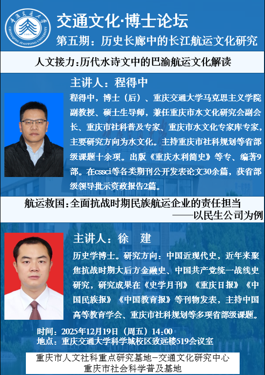 【交通文化·博士论坛】第五期:历史长廊中的长江航运文化研究