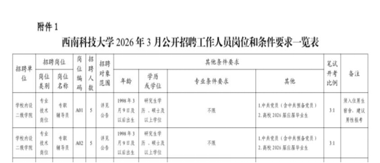 3.笔试时间及地点。定于2026年4月11日在西南科技大学(具体时间和具体地点详见《准考证》)举行。缺考笔试科目或笔试成绩为0分的报考者,视作自动放弃,取消报考资格。