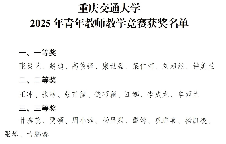 相关新闻:《重庆交通大学2025年青年教师教学竞赛决赛圆满落幕》(https://news.cqjtu.edu.cn/info/1081/64651.htm)