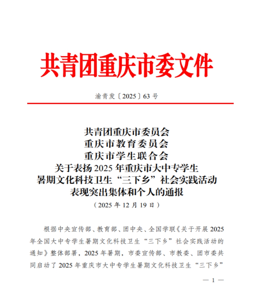 近日,共青团重庆市委员会、重庆市教育委员会、重庆市学生联合会联合下发通报,对在2025年重庆市大中专学生暑期文化科技卫生“三下乡”社会实践活动中表现突出的集体和个人予以表扬。我院师生凭借扎实的工作和出色的表现荣获两项殊荣: