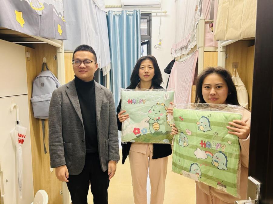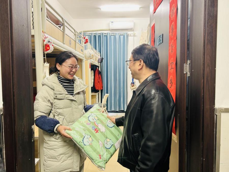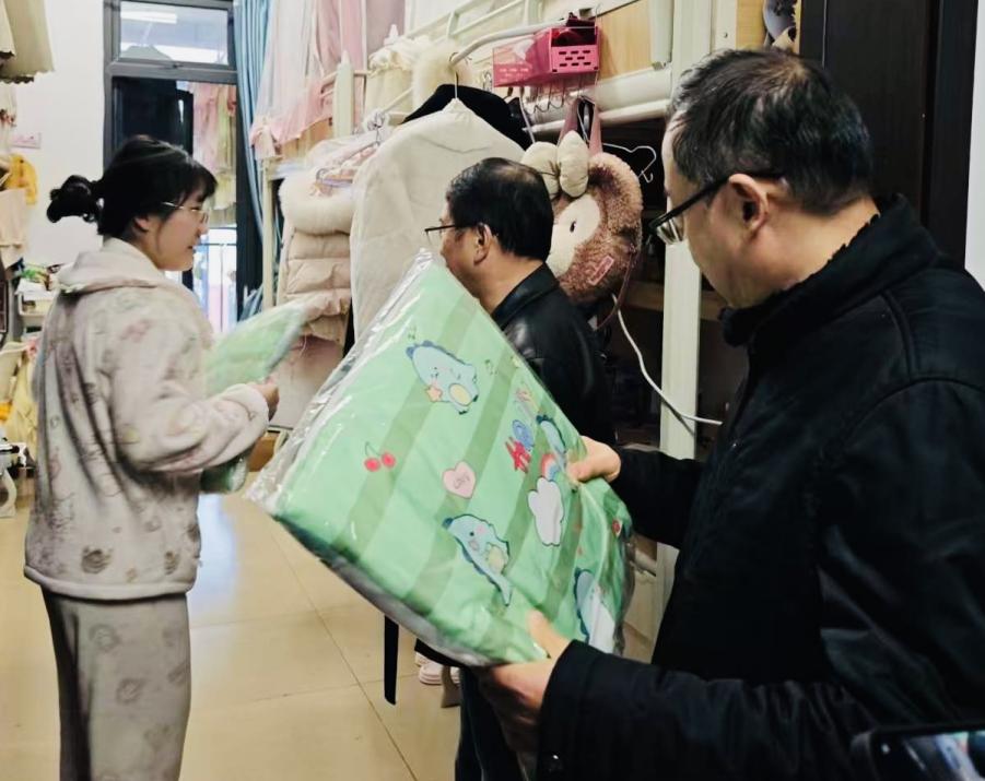 学院班子成员携带着慰问物资走进学生宿舍,与学生亲切交谈,了解他们的学习和生活近况。大家关切地询问学生们是否适应天气变化,提醒同学们做好防寒保暖,并叮嘱大家要注意身体健康,保持良好的生活习惯,注意寝室用电安全。