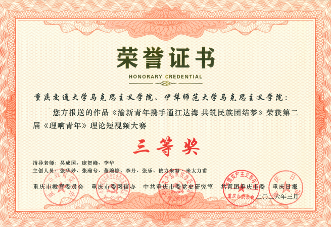 近日,我院在第二届《理响青年》理论短视频大赛中再获佳绩,创作拍摄的理论宣讲视频《渝新青年携手通江达海 共筑民族团结梦》荣获三等奖。