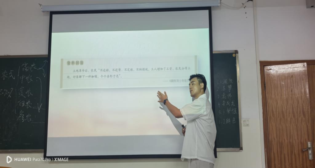 在暑期考察心得交流结束后,活动转入核心环节——思政课教学竞赛集体备课。本环节由李成龙老师担任主备人,他以《中国革命新道路的探索与开辟》为题,进行了教学展示和说课。从学理分析、内容重构、案例选取、互动设计、课件制作等方面,全面且细致地阐述了他的参赛课程设计思路。其严谨的逻辑、丰富的史料和富有感染力的讲述,充分展示了扎实的教学功底。